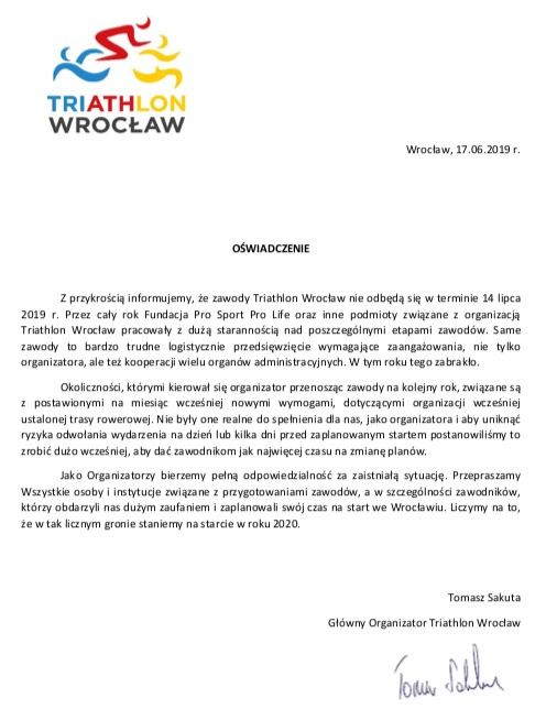 - (…) zawody to bardzo trudne logistycznie przedsięwzięcie wymagające zaangażowania, nie tylko organizatora, ale też kooperacji wielu organów administracyjnych. W tym roku tego zabrakło – piszą organizatorzy Triathlonu Wrocław w oświadczeniu o przeniesieniu imprezy na przyszły rok.