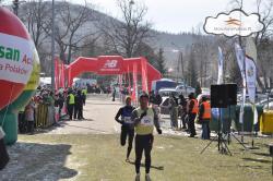Punktualnie o godzinie 11.00 wystrzał z armaty obwieścił start półmaratonu i prawie 2700 biegaczy wyruszyło w trasę. No i od razu pod górę. Tempo jednak bardzo spokojne, bo tłum nie pozwalał na szybsze. Doprowadziło mnie to do irytacji na kolejnym podbiegu w okolicach 4 kilometra. Parę osób delikatnie mówiąc lekko się przeliczyło i już na tym etapie podbieg pokonywali sapiąc i idąc. Do 7 kilometra wszystko gładko i cały czas trzymałem się za zającem na 1:40. Tutaj zaczął się najtrudniejszy podbieg na całej trasie, właśnie na Przełęczy Tąpadła. I tutaj pierwszy wniosek: sumienne wykonywanie podbiegów na treningach przyniosło efekty, bo te dwa kilometry minęły mi dosyć szybko i jakoś specjalnie nie wykończyły. Spodziewałem się czegoś gorszego. Na 10 kilometrze zameldowałem się po 50 minutach i 10 sekundach. Później seria szybkich zbiegów na których zaczęło się odrabianie straconych w pierwszej części dystansu sekund. I tu wniosek drugi: pomimo, że myślałem, że zbiegi są moją mocną stroną to właśnie na nich zając mi uciekał. I nie miało nawet znaczenia to, że dwunasty kilometr przebiegłem w 3:58. Po każdym zbiegu trzeba było delikatnie nadrabiać. Tak też trzymałem się za nim do 15 kilometra, gdzie systematycznie dystans między nami zaczynał się zwiększać. Próbowałem jeszcze walczyć, na 16 kilometrze przekalkulowałem, że do czasu 1:40 tracę około 35 sekund, ale na 19 i 20 kilometrze pierwszy raz w życiu doświadczyłem tzw. „ściany”. Odechciało mi się wszystkiego, a wiejący w twarz mroźny wiatr nie pomagał. To właśnie na tych dwóch kilometrach rozegrał się dla mnie prawdziwy bieg. Na 21 kilometrze wprawdzie wszystko minęło, bo było z górki i słychać już było spikera, ale nie było już szans walczyć o czas poniżej 1:40, ale…życiówka i tak została poprawiona i teraz wynosi 1h40min53s. Myślę, że na szybszej trasie śmiało mogę myśleć o czasie 1:38.