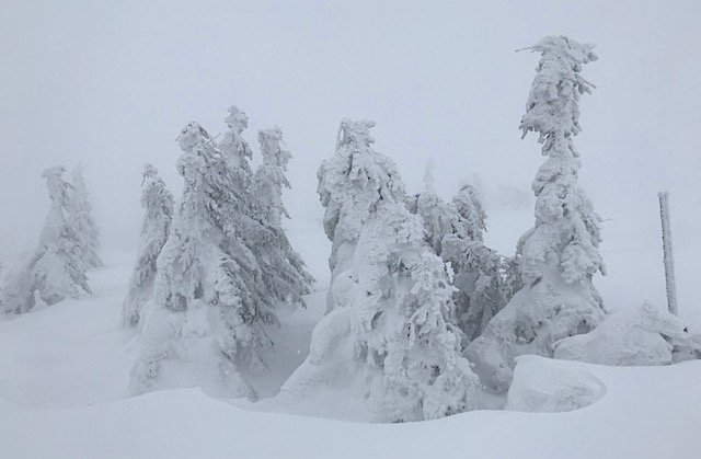 Trasa doskonale oznaczona pomimo ograniczonej widoczności. Żółte szarfy wskazują nam mozolną drogę do wspinania się na królewski szczyt Karkonoszy. To już 12. kilometr trasy. Śnieżne Kotły i Łabski Szczyt – 1472 m n.p.m. To już jest inny wymiar. Bardzo ograniczona widoczność. Zacinający śnieg. I ostry zbieg w dół. Mijamy Czeskie Kamienie. Zaczyna się robić naprawdę zimno. Byle do Odrodzenia, gdzie znajduje się kolejny punkt żywieniowy z ciepłą herbatą.