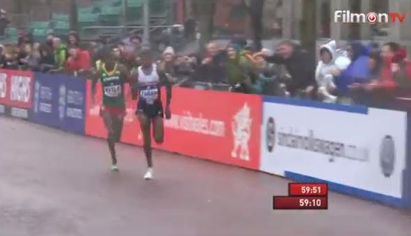 W krótkiej chwili nad trasę nadciąga prawdziwy pogodowy armageddon. Ulewa i mocny wiatr wprost atakują oczy biegaczy. Najlepiej z deszczem radzi sobie... pechowiec Kamworor, który na 20. kilometrze (czas 56:01) zostawia na na kilkadziesiąt metrów Muchiriego. Obrońca tytułu nie pozostawia złudzeń i wygrywa mistrzowski bieg z czasem 59:10.