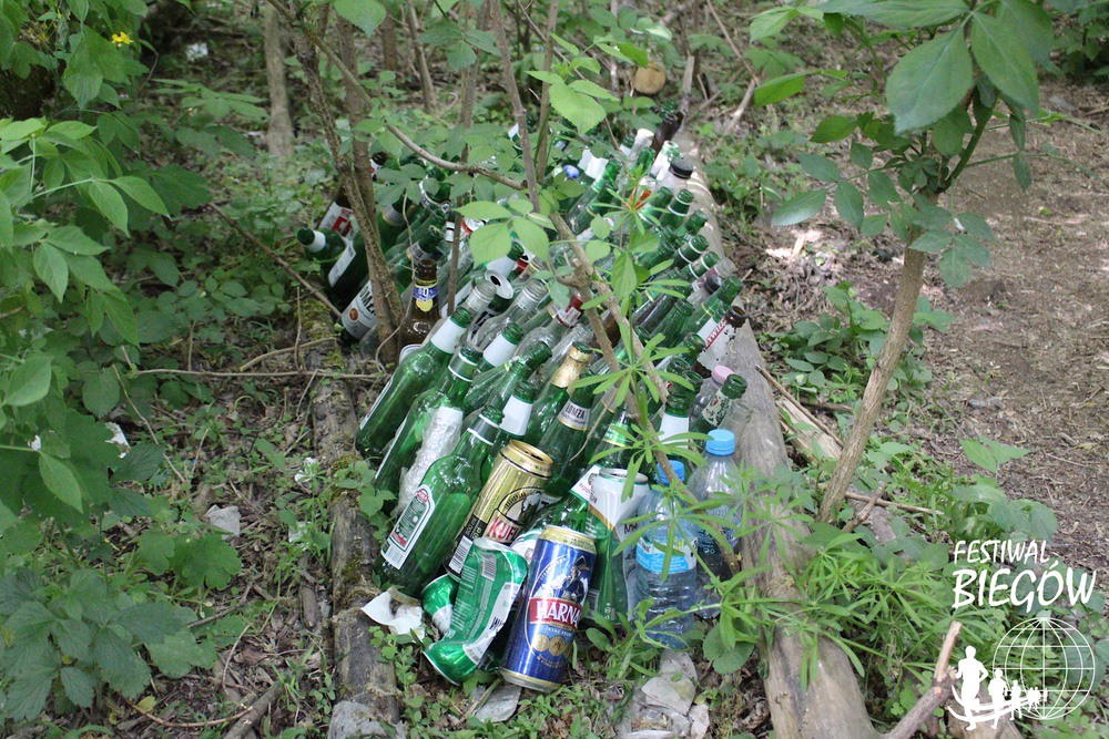 My towarzyszymy trójce uczestników. Pogoda dopisywała, śpiewały ptaki, ale sielanka skończyła się gdy 25-letni Marcin zaproponował by skręcić w lewo z głównego szlaku. Od razu kumulacja, choć nie było się z czego cieszyć. Trafiliśmy na staranie ułożony stos butelek po napojach procentowych. Obok pełno mniejszych śmieci. Spędzamy, tu chwilę, pierwszy worek się zapełnia błyskawicznie.