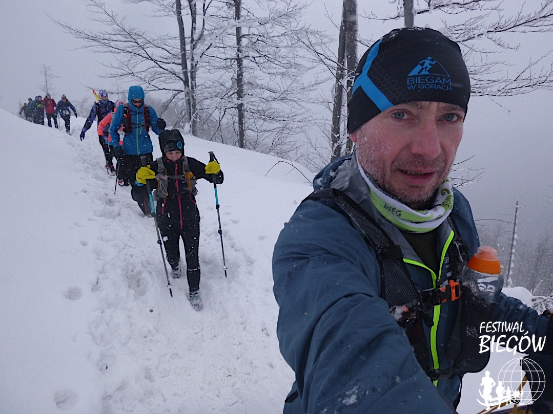 Na wywianym wiatrem grzbiecie przez mgłę widać tylko płatki śniegu w snopie światła. Rzeczywista temperatura to kilka stopni na minusie, ale odczuwalny mróz jest z pewnością dwucyfrowy. Mimo grubych rękawic, nie pierwszy raz tej nocy tracę czucie w palcach rąk – ale to u mnie normalne. W schronisku załapuję się na parę zdjęć od wspaniałej Karoliny Krawczyk, bez której Zamieć nie byłaby Zamiecią. Nawet nie szkodzi, że wszystkie pewnie wyjdą z pełnym ryjem, bo właśnie żuję batona.