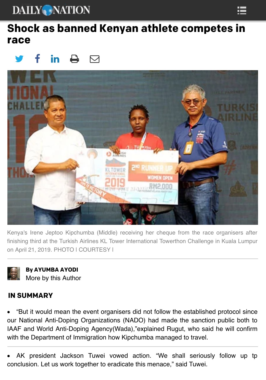 Zdaniem przedstawiciela Kenijskiej Agencji Antydopingowej, start zawodniczki to niedociągnięcie ze strony organizatorów, bo lista zawieszonych zawodników jest ogólnodostępna. Sami jednak dokładnie przyjrzą się sprawie. Wydarzenia z Kuala Lumpur traktują poważnie i chcą przeciwdziałać podobnym praktykom.