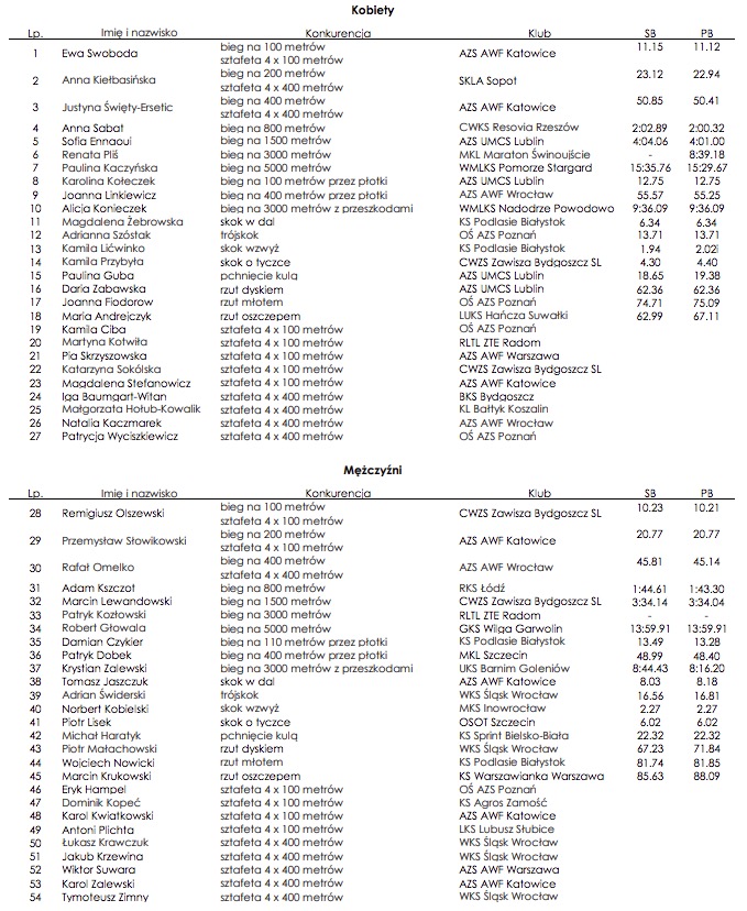 W sprincie na 100 metrów Polskę reprezentować będzie, mająca znakomite wspomnienia z Bydgoszczy (została tu wicemistrzynią świata U20 i mistrzynią Europy U23) Ewa Swoboda.