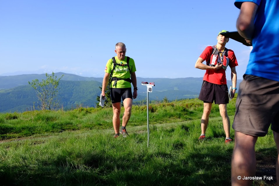 Punkt 9. zlokalizowany na przełęczy Przysłopek osiągnęliśmy dosyć szybko i dowiedzieliśmy się, że pierwszy na nim zameldował się Maciej Więcek, który jak się potem okazało był pierwszy również na mecie. Nas czekało jeszcze odwiedzenie trzech punktów, z czego pierwszym był najwyższy szczyt Beskidu Wyspowego – Mogielica (1171 m n.p.m.). Jak większość ludzi wybraliśmy troszkę dłuższy, za to bezpieczniejszy wariant przejścia żółtym szlakiem. Na szczycie pamiątkowe zdjęcie z charakterystyczną wieżą w tle i zapisanie w pamięci spostrzeżenia – „pięknie tutaj jest, muszę odwiedzić to miejsce jeszcze w tym roku”.