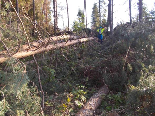 Czwarty punkt wiązał się z ostrym podejściem pod górę – optymalną trasą był jednak prowadzący na nią szlak, także po godzinie byliśmy już na miejscu. Następny punkt był zlokalizowany stosunkowo blisko – sztuka dotarcia do niego polegała jednak na odbiciu ze szlaku w odpowiednim miejscu. Wypatrzyliśmy gdzieś ludzi ze znajomej grupy z początku biegu i to ich postanowiliśmy się znowu trzymać. W pewnym momencie skręciliśmy w lewo, ale po kilkunastu minutach stwierdziliśmy, że chyba jednak za wcześnie. Chcąc wrócić najszybszą drogą dostaliśmy się w bardzo gęsty las, przez który przedzieraliśmy się kilkanaście kolejnych minut, by wyjść od drugiej strony miejsca z którego pierwotnie zboczyliśmy.