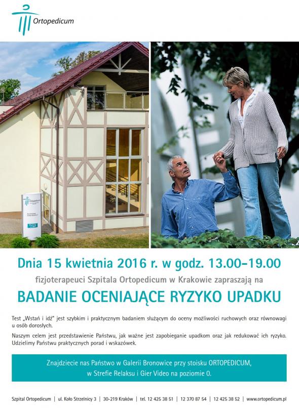 Fizjoterapeuci Szpitala Ortopedicum w Krakowie zapraszają dnia 15 kwietnia 2016 r. do Galerii Bronowice na badanie oceniające ryzyko upadku.