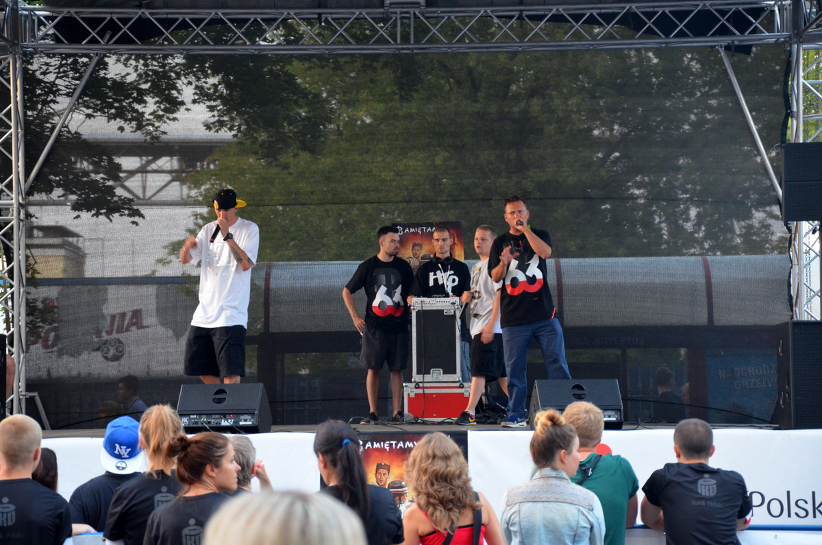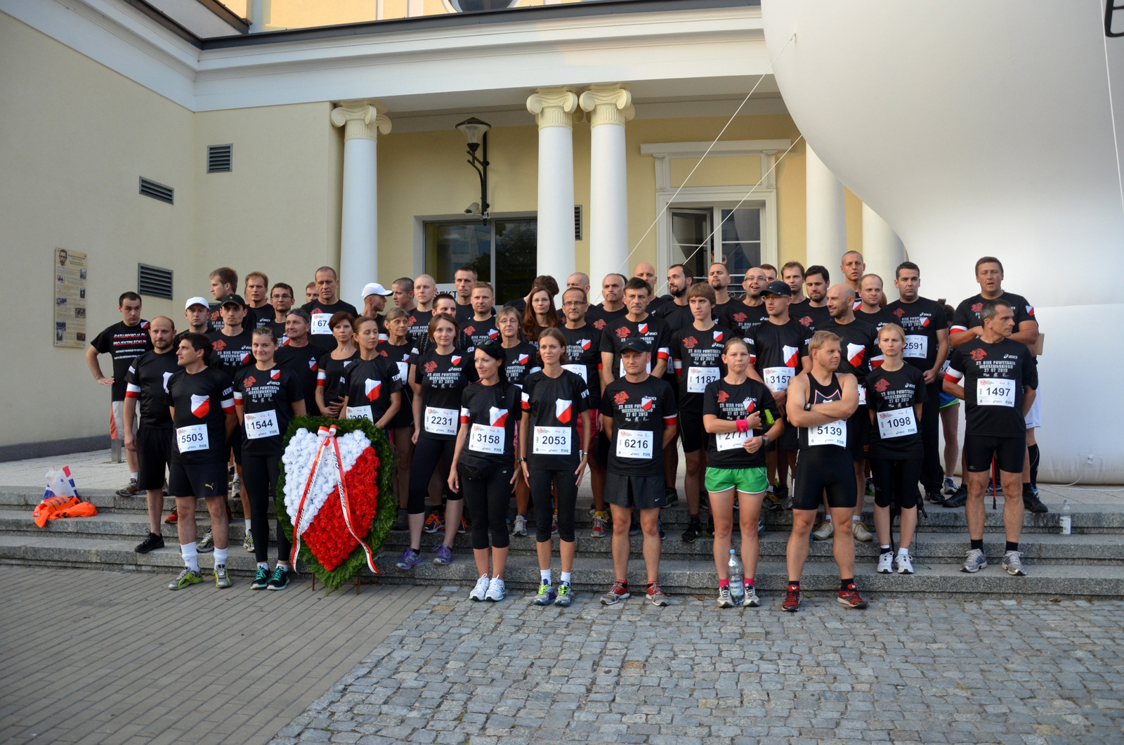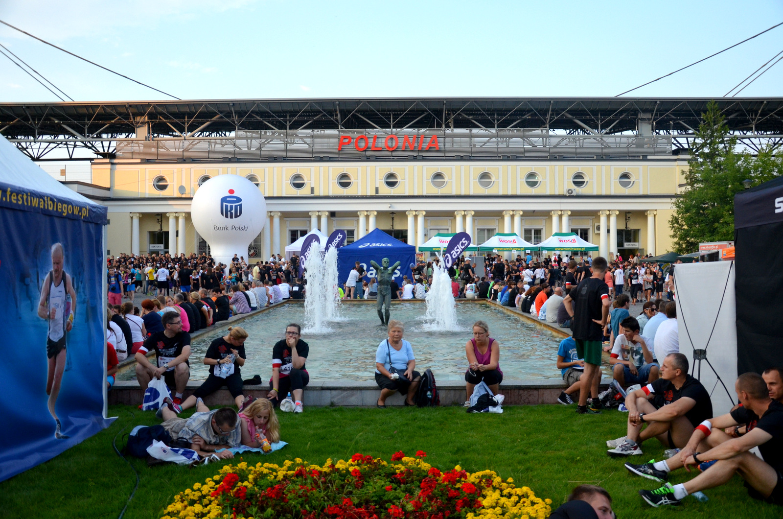 Stadion przy Konwiktorskiej około godziny 19:30 oblegany już był przez ludzi w czarnych koszulkach z ?kotwicą? i biało-czerwoną opaską na ręce. Część ustawiała się do namiotów, żeby pobiec w akcji charytatywnej, cześć stała gdzieś po napoje, inni mogli przyjść do naszego stanowiska Festiwalu Biegowego. Niektórzy zajęli się też zwiedzaniem Stadionu Polonii i rozgrzewką lub słuchaniem koncertów na scenie głównej. Każdy znalazł coś dla siebie. Ja wybrałem rozgrzewkę.