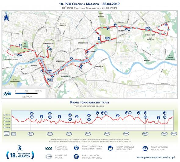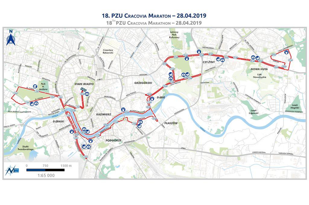 Przedstawiamy trasę 18. PZU Cracovia Maraton, który zostanie zorganizowany 28 kwietnia 2019 roku. Podobnie jak w poprzedniej edycji biegu, rywalizacja odbędzie się na jednej pętli, a maratończycy zawitają też do Nowej Huty. Jak ma to miejsce od 2014 roku, po raz kolejny start i meta jednego z największych tego typu wydarzeń w Polsce, zaliczanego do Korony Maratonów Polskich, usytuowane zostaną w samym sercu Krakowa – na Rynku Głównym. Zgodnie z hasłem imprezy: „z historią w tle”, uczestnicy maratonu przebiegną obok wielu wspaniałych zabytków podwawelskiego grodu.