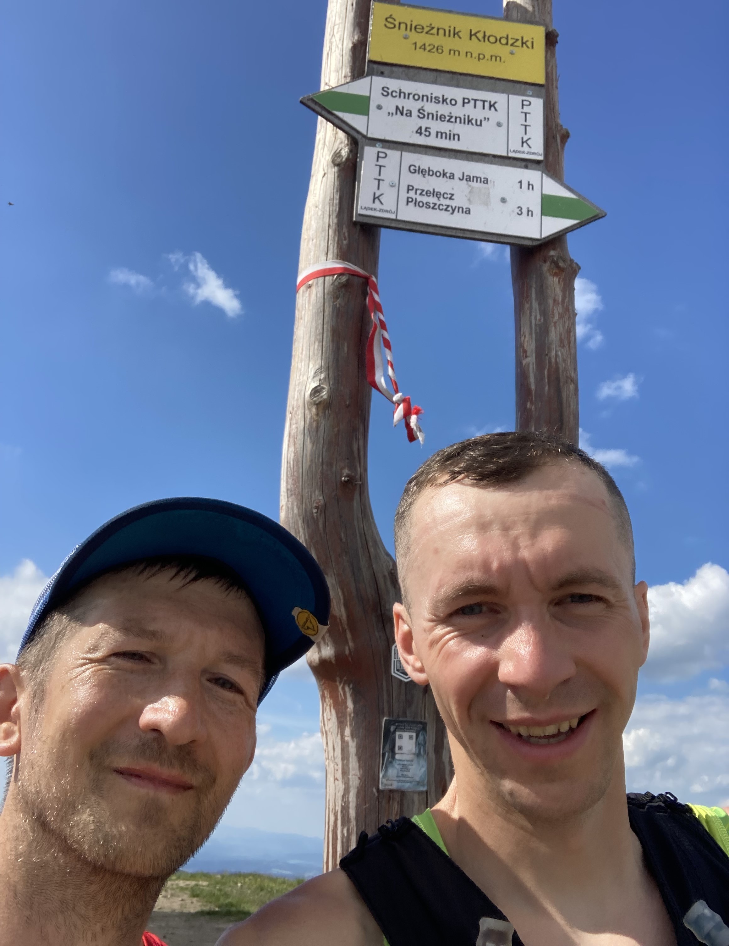 Na Orlicę wbiegaliśmy już jak szaleni, ponieważ nasz smród przyciągał już chyba całe lokalne latające robactwo. Naprawdę jakaś szarańcza nad nami latała i nie chciała dać za wygraną. Przy Orlicy kolejna wieża widokowa. Na szczycie szybka fotka i prawie sprint w dół. Podczas zbiegu w dół odbieram telefon do Andrzeja, że będą parę minut później (ostatecznie są zgodnie z planem). Dobiegamy do auta i lecimy do Karłowa.