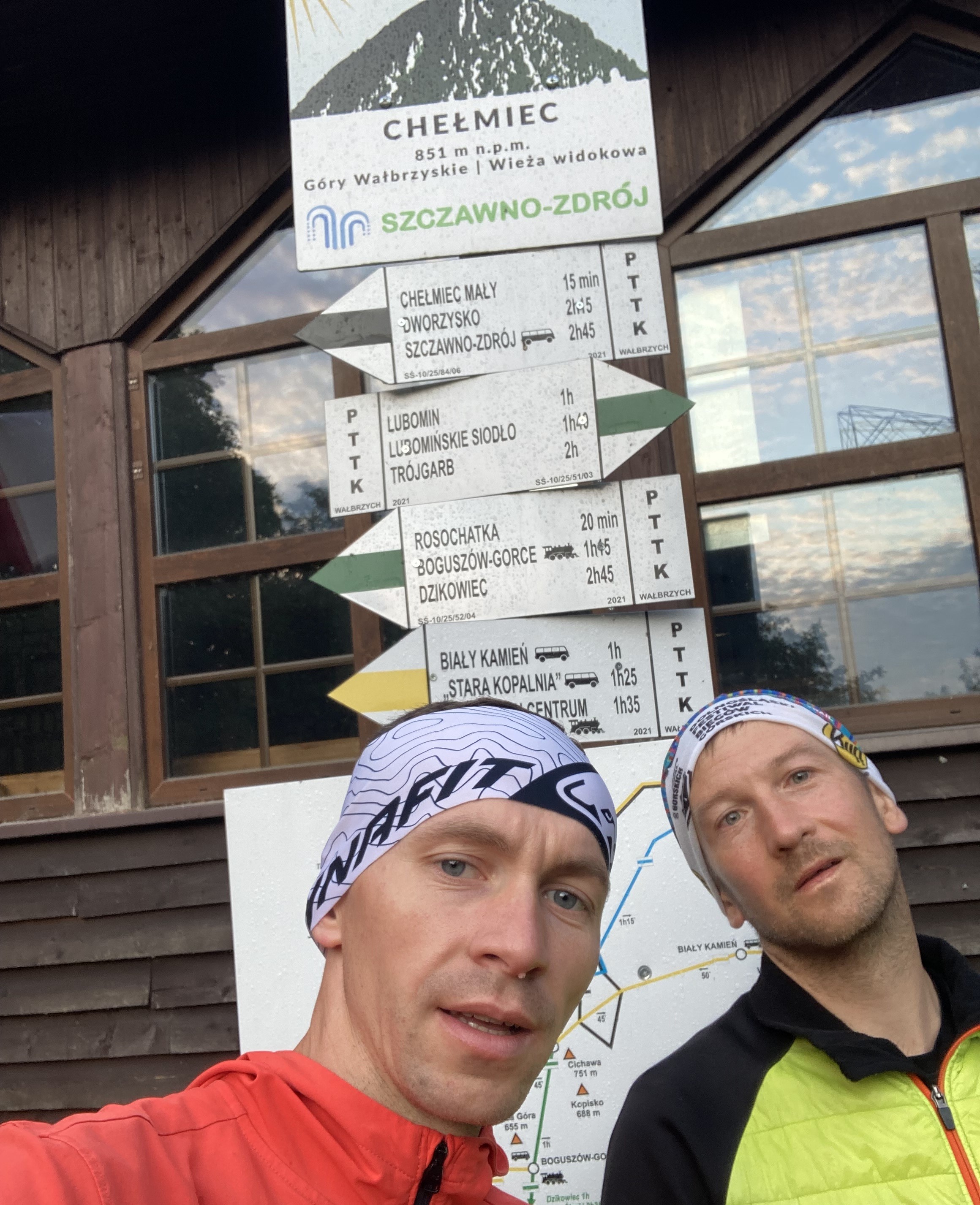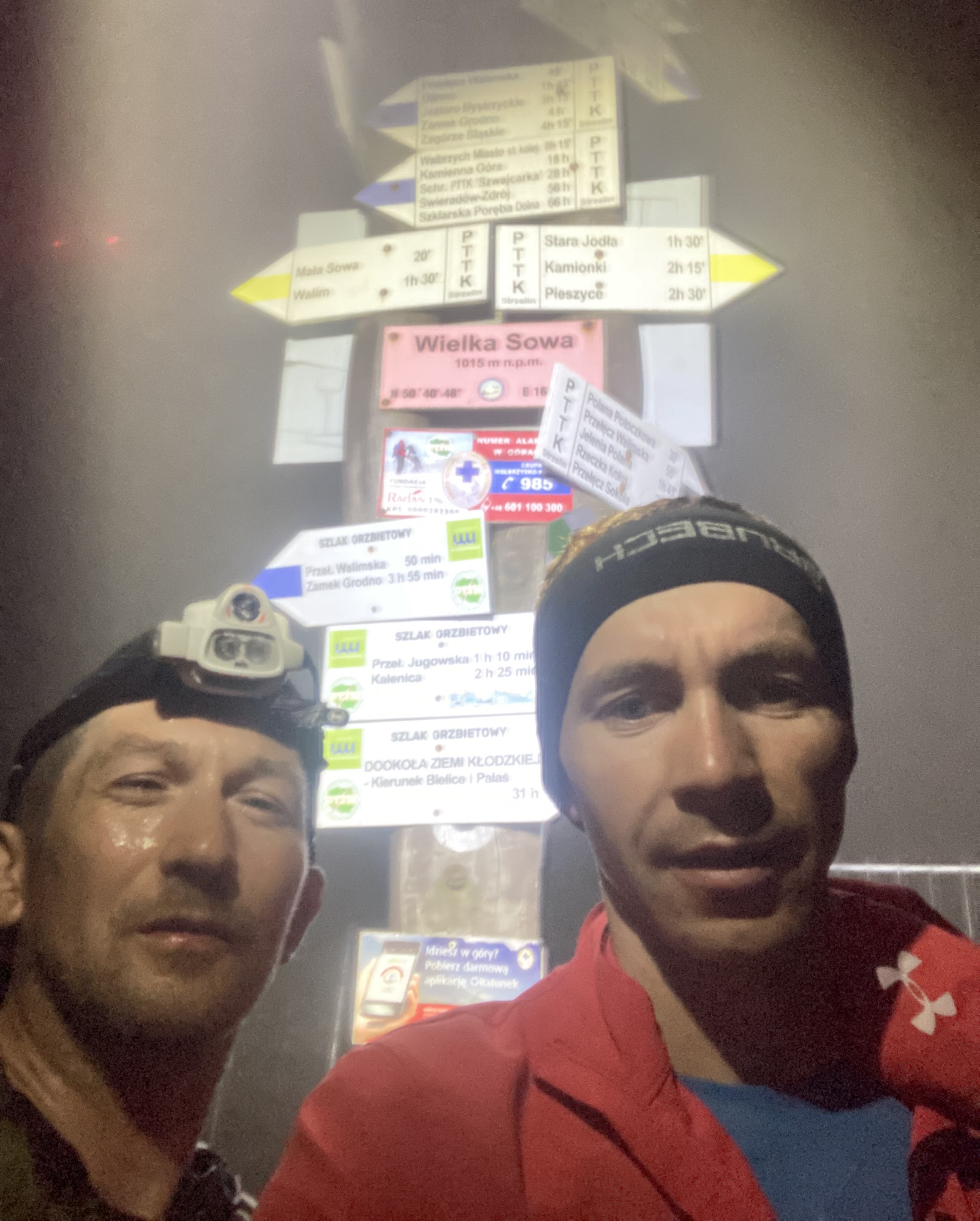 Na samej górze było już takie mleko, że nie potrafiliśmy znaleźć słupka z tabliczką. W końcu jednak go znajdujemy i oświetlając go dwoma czołówkami robimy sobie zdjęcie. W drodze w dół mgła trwa dalej, więc mylimy na chwilę drogę, szybko jednak track w zegarku nas zawraca. Mijamy kolejne świecące oczy w lesie i biegniemy dalej. Wybiegamy na asfalt i lecimy w stronę busa. Niestety mój odcisk zaczyna co raz to bardziej o sobie przypominać. Dobiegamy do busa i  lecimy dalej