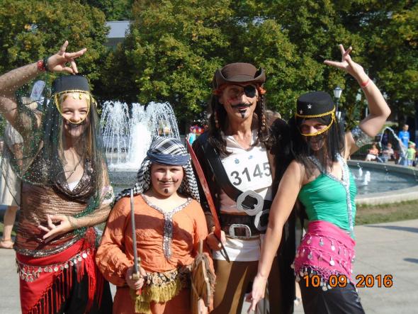 Na kilka godzin stałem się piratem, kapitanem Jackem Sparrow ze słynnego filmu „Piraci z Karaibów” . Należę do grupy biegaczy długodystansowych dla których bieganie to nie tylko duzy wysiłek fizyczny ale przede wszystkim radość z uprawianego sportu. Liczyło się wymyślne przebranie niż czas i miejsce na mecie. Bieg miał formę konkursu na najpiękniejsze przebranie. Organizatorzy przeznaczyli nagrody dla pierwszych trzech zawodników w fantazyjnych strojach.