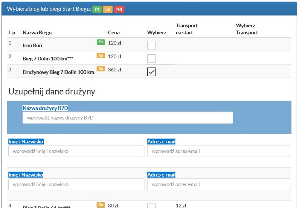 Będzie łatwiej i przejrzyściej: CAŁĄ drużynę zgłasza jej kapitan. Po zaznaczeniu w formularzu rejestracyjnym pozycji „Drużynowy Bieg 7 Dolin 100 km”, rozwiną się pola dodatkowe, w które kapitan wpisuje nazwę drużyny i podstawowe dane 2 pozostałych zawodników zespołu (imię, nazwisko, adres mailowy).
