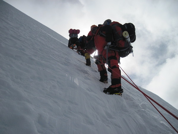 Droga do obozu na wysokości 7100m n.p.m., czyli droga na Przełęcz Północną. Z tych najtrudniejszych odcinków ten i tak był najłatwiejszy, chyba przede wszystkim z tego powodu, że nie trzeba tu jeszcze korzystać z masek tlenowych, które z jednej strony stanowią jedyny ratunek, zwłaszcza na wysokości ponad 7700m n.p.m., a z drugiej strony jest z nimi sporo kłopotów.