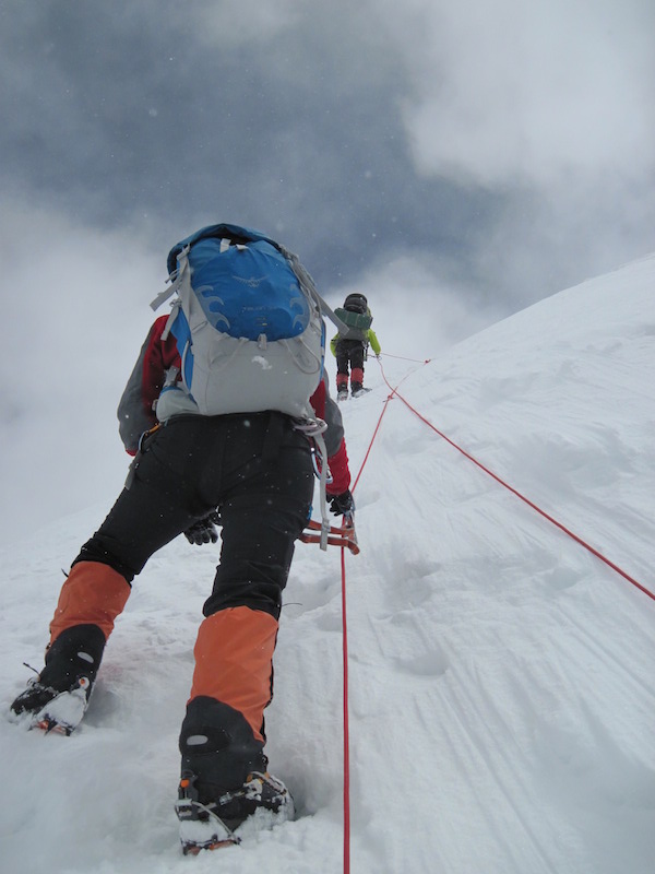 Droga na Przełęcz Północną. Dwie liny poręczowe – rozpięte w ten sposób, by w najtrudniejszych momentach ci, którzy idą z góry, mogli bez problemu wymijać tych, którzy idą z dołu.