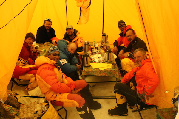 A tak wygląda nasza szóstka na chwilę przed wyjściem z obozu na wysokości 7100 m n.p.m. To też jest ostatni obóz, który ma, oprócz namiotów, także wspólną jadalnię. Właśnie skończyliśmy śniadanie.