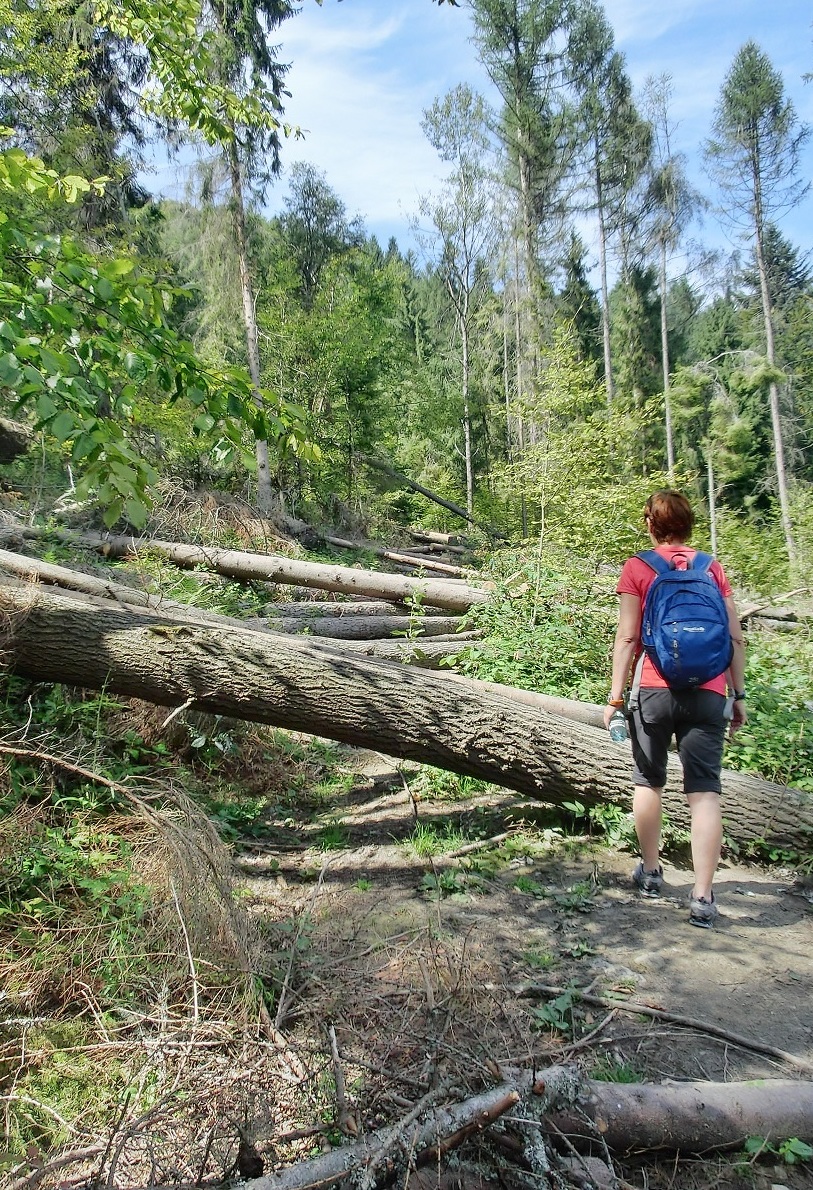 Spotykamy znajomych, który ukończyli 100 km. Rozmawiamy. Każdy narzeka na ostatni zbieg przed metą. Po czerwcowym wiatrołomie szlak nie do końca jest drożny. Byliśmy tu w czerwcu, od razu po wiatrołomie, i wtedy nie doszliśmy szlakiem do Krynicy. Musieliśmy obejść to miejsce polami. W piątek poszliśmy jeszcze raz sprawdzić ten "zawalony odcinek" i stwierdziliśmy, że zawodnicy muszą zastosować skipy przy pokonaniu tego odcinka.