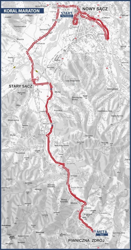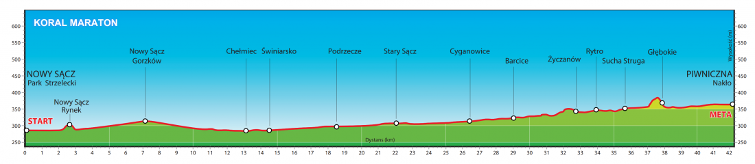W tym roku, trasa Koral Maratonu wiedzie z Nowego Sącza, z Parku Strzeleckiego, do Piwnicznej Zdrój, do naszego Miasteczka Biegowego na Nakle. W porównaniu z poprzednimi, ta trasa jest o wiele łatwiejsza. To będzie więc również dużo szybsza trasa, łatwiej będzie osiągnąć dobry czas, a może nawet życiówkę.
