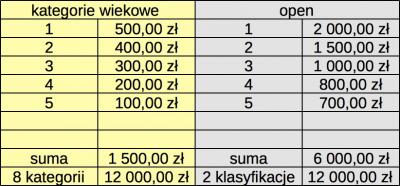 Kolejny raz w sposób bardzo znaczący podnosimy pulę nagród, biegaczom wypłacimy w sumie aż 24 tysiące zł (w tym roku było to 10 tys. pln)! Gratyfikacje finansowe wywalczy też większa liczba uczestników – po 5 najlepszych biegaczek i biegaczy w klasyfikacji generalnej (od 2000 do 700 pln) oraz po 5 zawodników (od 500 do 100 pln) – w czterech kategoriach wiekowych obu płci: do lat 29, 39, 49 i od 50 wzwyż. W sumie nagrody finansowe zdobędzie aż 50 osób!