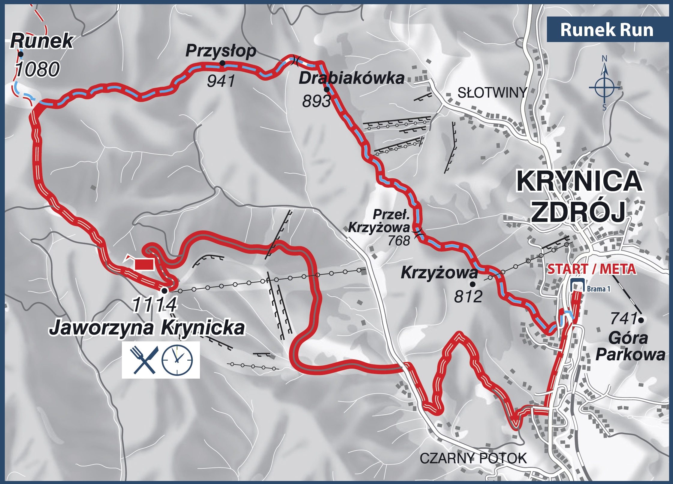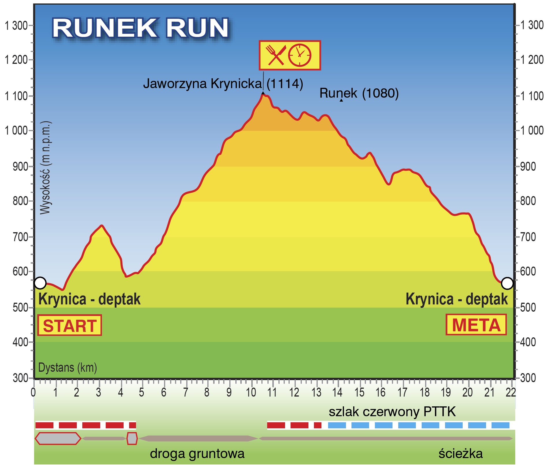 Po kolei. Runek Run 2018 wystartuje, oczywiście, z krynickiego deptaku o godzinie 9:00. Trasa prowadzi przez doskonale znany uczestnikom Festiwalu Czarny Potok do najwyższego punktu – na Jaworzynę Krynicką. Szczyt o wysokości 1114 m n.p.m. znajduje się dokładnie w połowie trasy – tam też będzie zlokalizowany jedyny punkt serwisowy, z napojami i przekąskami.