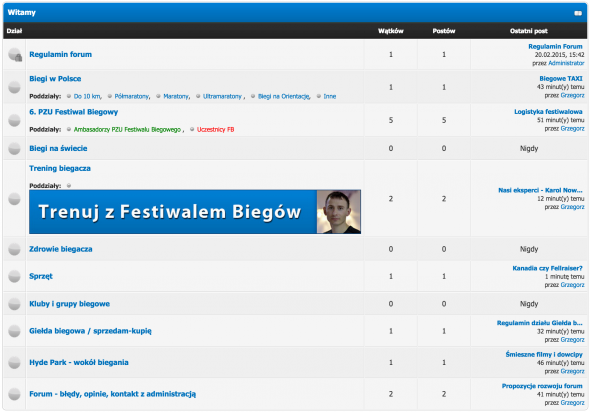 Zakładajcie swoje tematy i komentujcie wpisy biegowych koleżanek/kolegów. Dodajcie zdjęcia do postów (uwaga na ich rozmiar), cytujcie wypowiedzi. Używajcie poprawnej polszczyzny, unikajcie wulgaryzmów, nie obrażajcie. Wpierw załóżcie swój profil – im dokładniejszy opis, tym lepiej dacie się poznać forumowiczom.