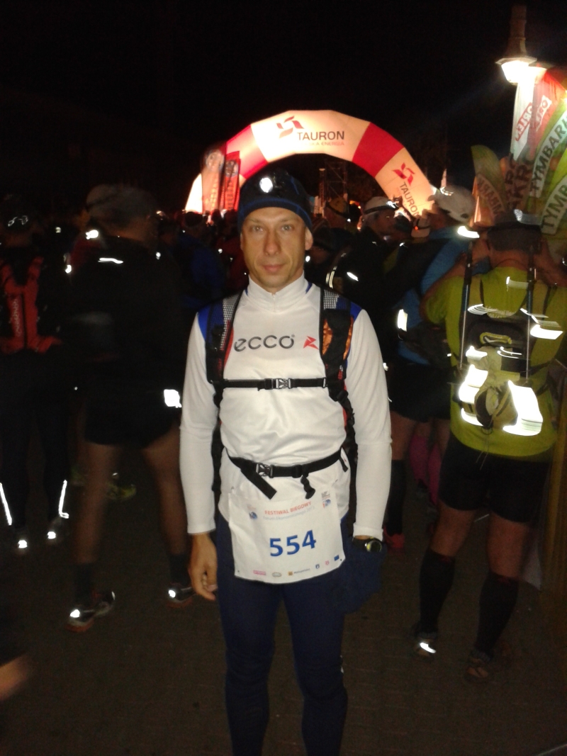 W międzyczasie wymieniałem kilka zdań grzecznościowo z innymi uczestnikami biegu – najczęściej dominował wątek – „co ja tu w ogóle robię …” lub pytanie o doświadczenie (ultra)maratońskie oraz życiówki osiągane na tych dystansach. Czasami gdzieś z tłumu wyłonił się dowcip lub niecenzuralny kawał. I to jest właśnie przewaga biegów ultradługich nad krótszymi dystansami, bo można pogawędzić trochę z innymi, nie tracąc zanadto cennego czasu. Choć ta lista zalet ultra zapewne nie jest zbyt długa… A przynajmniej dla mnie – gdyż dla zdrowia można biegać regularnie co tydzień 10-tki, no może co najwyżej półmaratony. Niestety z biegami ultradługimi raczej ten numer nie przejdzie, chyba że jest się takim gościem jak Scott Jurek lub Piotr Kuryło. Wtedy licznik kilometrów biegnie inaczej.