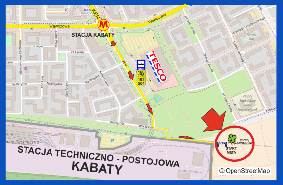 Miejsce startu, polana na tyłach hipermarketu Tesco na Ursynowie, obok zajezdni Technicznej Metra Warszawskiego. BIURO ZAWODÓW czynne od godz 9:30.