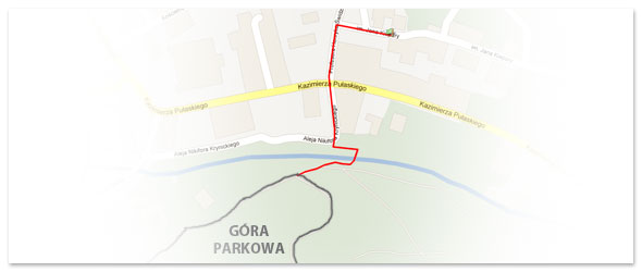Biegniemy w dół ok. 100 m ul. J. Kiepury po czym dobiegamy do ul. Świdzińskiego i biegniemy cały czas w dół. Przecinamy ul. Pułaskiego i kierujemy się do Parku Zdrojowego. Dobiegamy do mostka i dalej ok. 100 m lekko pod górę alejką Parku Zdrojowego. Następnie ostro zakręcamy w lewo i biegniemy lekko do góry ok. 100 m aż dobiegamy do startu i mety pętli w Parku Zdrojowym.
