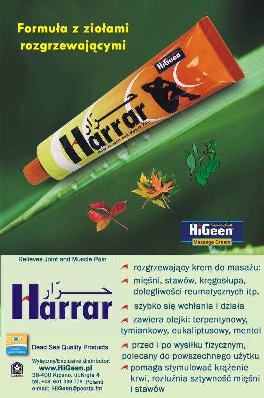 Krem z naturalnymi olejkami eterycznymi o właściwościach rozgrzewających HARRAR 120ml - 30zł, przy zakupie 3 szt i więcej lub razem z minimum 1 kosmetykiem GLORY - cena 28zł/szt.