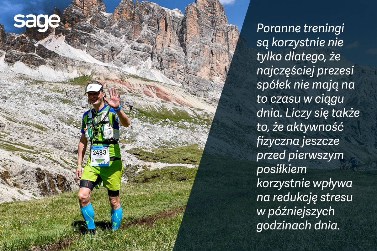 Ludzie sukcesu nie od razu biegną do biura. Ursula Burns, prezes zarządu Xerox o 6 rano rozpoczyna godzinny trening na siłowni. Steve Murphy, szef domu aukcyjnego Christies uprawia co rano yogę. Poranne treningi są korzystnie nie tylko dlatego, że najczęściej prezesi spółek nie mają na to czasu w ciągu dnia. Liczy się także to, że aktywność fizyczna jeszcze przed pierwszym posiłkiem korzystnie wpływa na redukcję stresu w późniejszych godzinach dnia. Ma także dobroczynny wpływ na formę, sylwetkę i pomaga zwalczać bezsenność.