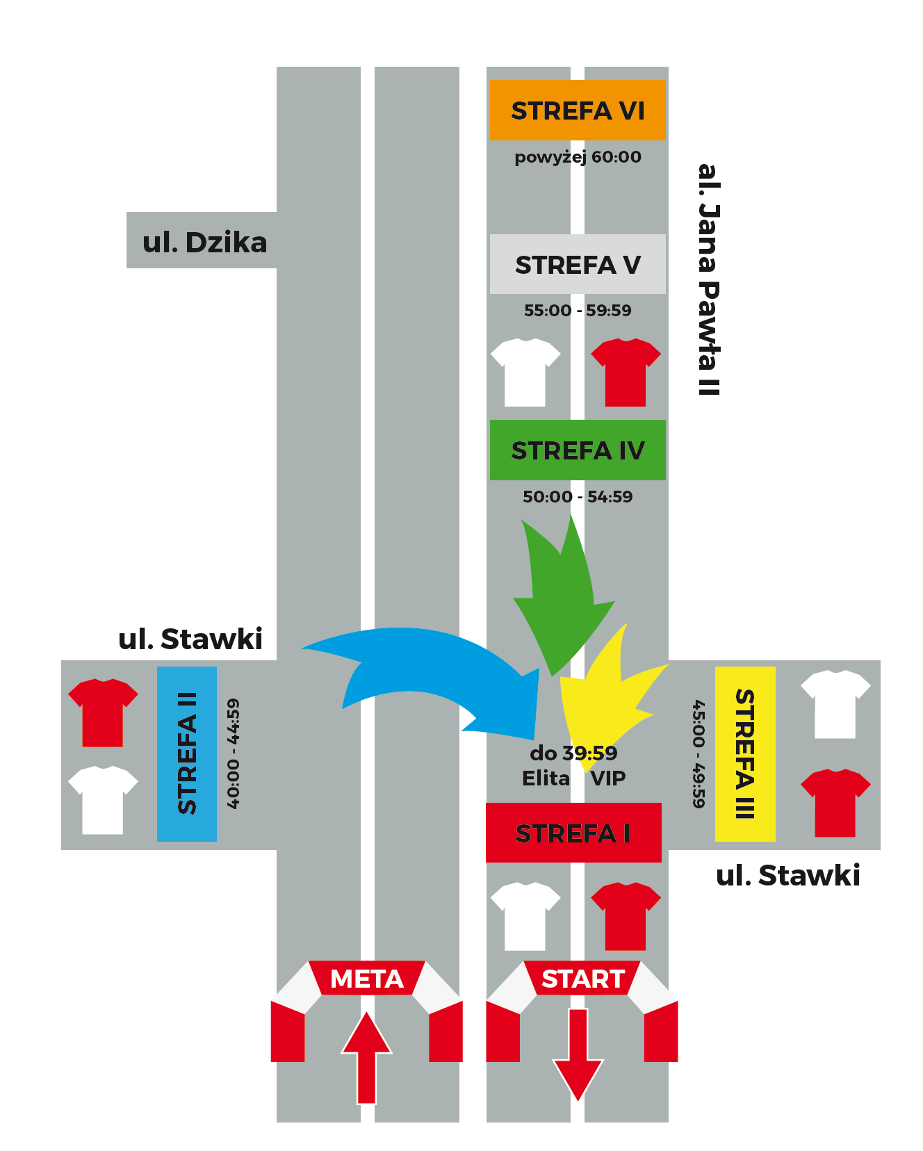 Rekordowa liczba 18 tys. uczestników wystartuje w sześciu falach podzielonych pod względem rekordów życiowych. Pierwsza o godzinie 11:11 wyruszy elita złożona z osób legitymujących się najlepszym czasem do 40 minut. Kolejne grupy ruszać będą w odstępie 4-5 minut, do tego trzeba dodać czas startu poprzedniej fali. Część z uczestników, zanim rozpocznie swój bieg, będzie mogła więc z przeciwnego pasa al. Jana Pawła oklaskiwać zwycięzców i kolejnych dobiegających na metę.