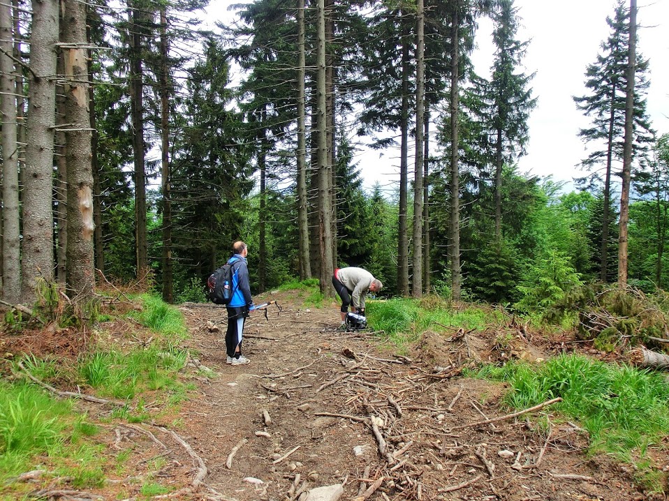Po posiłku ruszamy w dalszą drogę. Na Złomistym Wierchu mamy na szlaku duże utrudnienia. Drzewa zwalone jak zapałki. Próbujemy ominąć przeszkody. Andrzej Q gubi część kijka. I tak do Wielkiego Rogacza. Tempo spada. Mamy w nogach 50 km. Hurra!